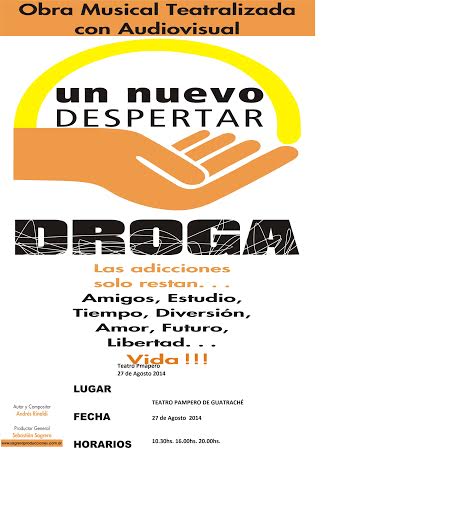 27 de Agosto se realizarán tres funciones en los siguientes horarios, 10,30 hs. – 16 hs. y 20 hs. esta es una obra, que encierra la historia de vida de tres chicos, de diferentes clases sociales, pero con una misma problemática: LA DROGA