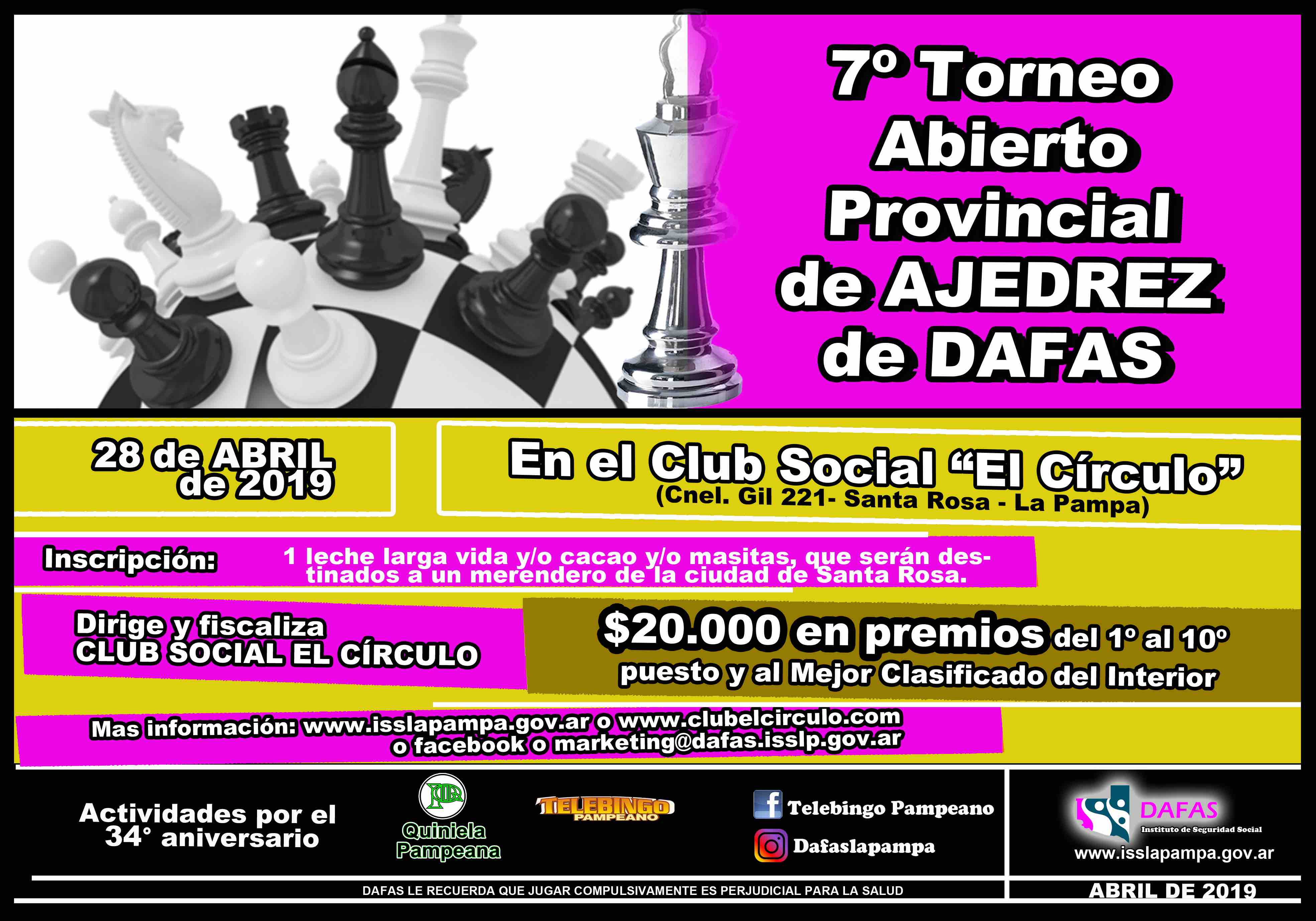 Como parte del programa aniversario de la Dirección de Ayuda Financiera para la Acción Social (DAFAS), el próximo domingo 28 de abril en el “Club El Círculo” de Santa Rosa, se llevará a cabo la el  7° Torneo Abierto Provincial de Ajedrez. Pondrá en juego 20 mil pesos en premios, entre el primero y décimo puesto.
