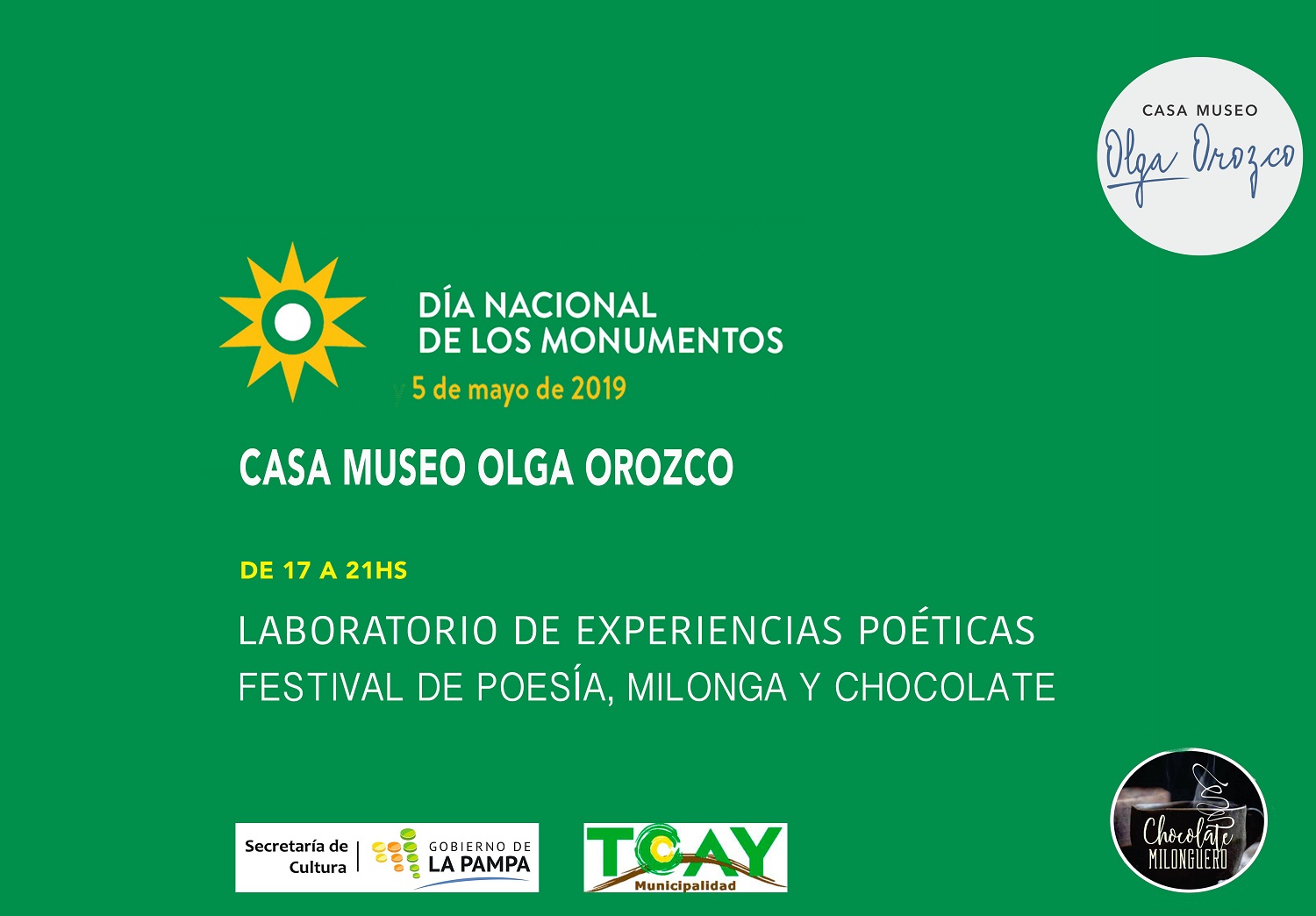 La Casa Museo Olga Orozco (CMOO) “Lugar Histórico Nacional” por Ley Nº 26156 sancionada el 11 de octubre de 2006, propone diversas actividades que se desarrollarán durante el domingo 5 de mayo de 17 a 21. Podrá visitarse el recientemente reinaugurado Museo, donde niños y adolescentes podrán participar de un “Laboratorio de experiencias poéticas” en el jardín de la Casa y aquellos que deseen bailar tendrán su oportunidad en el “Festival de poesía, milonga y chocolate”, en el Auditorio La Fantasma.