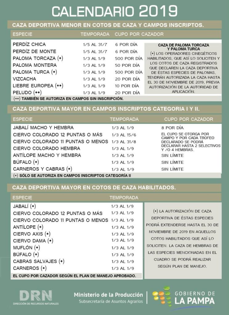 Desde el Ministerio de la Producción del Gobierno de La Pampa se confirmó el calendario de la temporada de Caza Deportiva Mayor y Menor 2019.
