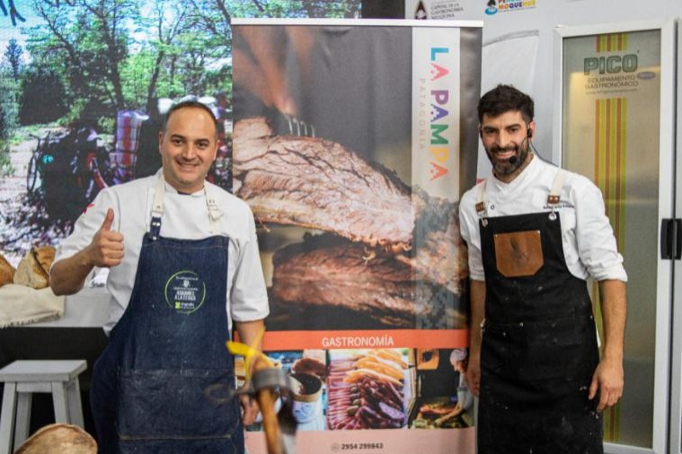 Representando a la provincia de La Pampa, el chef oriundo de General Pico, Martín García, cocinó junto a José Ortuño de la provincia de Neuquén, pan chato con harina agroecológica, oliva y piñones con una emulsión de berenjenas asadas, ajo y un chorizo de cerdo con especias.