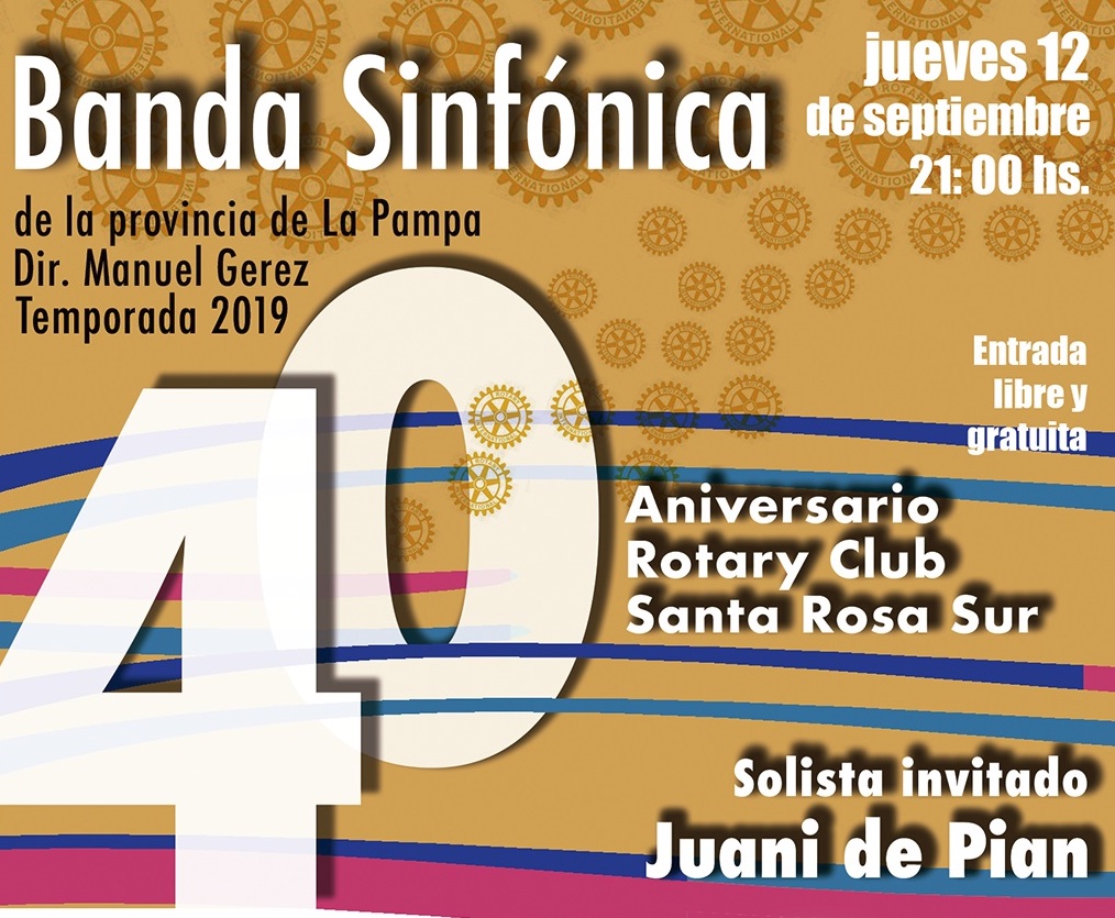 La Banda Sinfónica de La Pampa perteneciente a la Secretaría de Cultura del Gobierno, en el marco de la nueva propuesta denominada “Conciertos extraordinarios”, se presenta este jueves 12 de septiembre en el Teatro Español, para celebrar el 40 aniversario del Rotary Club Santa Rosa Sur. Con la participación como invitado del cantante Juani De Pian, el concierto será a las 21, con entrada libre y gratuita.
