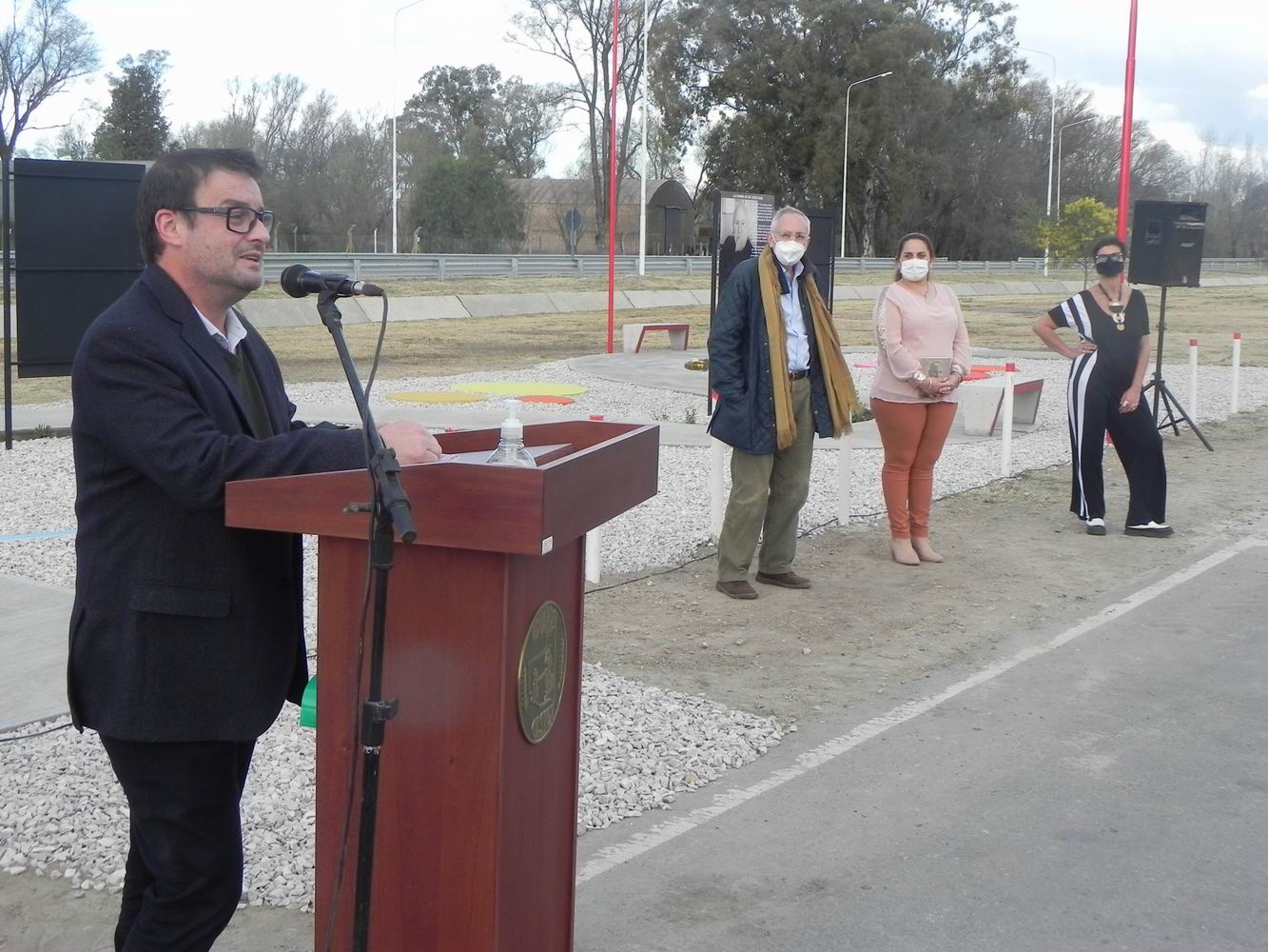 El ministro de Educación de La Pampa, Pablo Maccione; la intendenta Mónica Curutchet; la secretaria de Cultura, Adriana Maggio; diputados nacionales y provinciales; el hijo Ariel, familiares y vecinos participaron del acto que se realizó sobre la colectora Lali Robledo, a la vera de la ruta nacional 35.